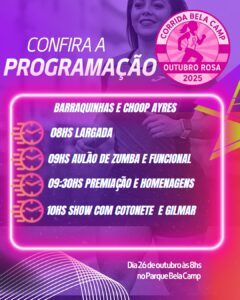 Neste domingo (26), acontece a 6ª Corrida Parque BelaCamp, em alusão à campanha “Outubro Rosa”, que visa conscientizar sobre o câncer de mama. O evento alcançou mais de 500 inscrições em apenas uma semana. O cadastro foi gratuito, por plataforma online. A troca do número de participação será feita mediante a entrega de alimentos não perecíveis, uma unidade, exceto sal e fubá. A largada do evento ocorre às 8h.