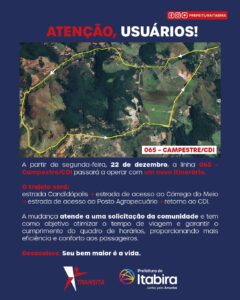 A linha Campestre/CDI (065) passa a operar novo percurso, passando pela estrada Candidópolis, Córrego do Meio e Posto Agropecuário até o Centro do Distrito Industrial (CDI). Segundo a Transita, as alterações atendem solicitações dos passageiros, otimizando o tempo de viagem da comunidade.