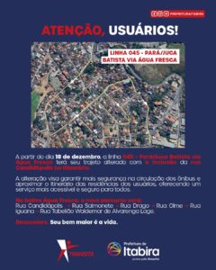Desde essa quinta-feira (18), a linha Pará/Juca Batista via Água Fresca (045) passou a incluir a rua Candidópolis no seu itinerário, aproximando o trajeto das residências e ampliando a segurança dos usuários. Começa na segunda-feira (22) outra alteração na prestação do serviço de transporte coletivo.