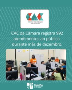 O Centro de Atendimento ao Cidadão (CAC) da Câmara Municipal de São Gonçalo do Rio Abaixo divulgou o seu último relatório mensal referente a 2025. O dispositivo funciona desde 2014. O balanço das atividades desenvolvidas ao longo do mês de dezembro aponta que foram 992 atendimentos à população, com 4.415 cópias registradas neste período.