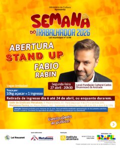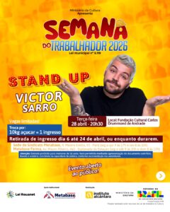 A abertura oficial acontece na segunda-feira (27), às 20h30, na Fundação Cultural Carlos Drummond de Andrade (FCCDA), com apresentação de stand-up do humorista Fábio Rabin. Na terça-feira (28), no mesmo horário e local, o público poderá assistir ao show do também comediante Victor Sarro. Na quarta-feira (29), está prevista uma palestra, às 19h30, com local e personagem ainda em processo de confirmação.